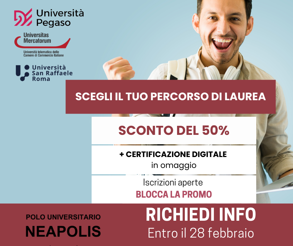 Benvenuti al Polo Universitario Neapolis, il punto di riferimento di eccellenza delle più prestigiose Università digitali d'Italia. Siamo entusiasti di essere convenzionati con il gruppo Multiversity, leader nel settore educativo in Italia e tra i primi dieci a livello mondiale proprietario dei brand Università Pegaso, Università Mercatorum e Università San Raffaele di Roma.